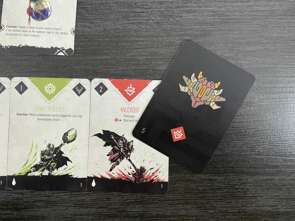Et c’est ce qui fait le sel de Primal, cette interactivité permanente avec l’IA, lui donnant vie et lui permettant de transcender son statut de simple tas de cartes automatisé. Tout au long de la partie, le monstre aura sur son plateau un set de 3 cartes, changeant régulièrement, et indiquant des événements déclenchant chez elle une réaction. Qu’il s’agisse de votre positionnement ou des cartes que vous jouez, la créature aura de nombreuses opportunités de s’en prendre à vous pendant votre tour, et vous devrez souvent peser le pour et le contre entre jouer un combo puissant et risquer un féroce retour de bâton.