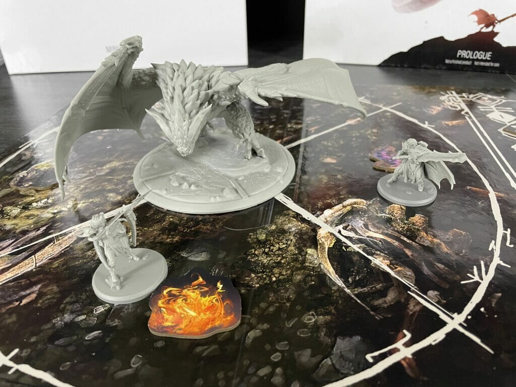 Si j’entends le fait que les figurines des personnages sont essentielles pour beaucoup de joueurs, nul doute qu’une « offre “meeple » à la manière de The Great Wall aurait permis de tirer les prix à la baisse, tout en offrant l’avantage de proposer quelques éléments de décor en trois dimensions. Le plateau de jeu étant déjà réduit à son strict minimum, le choix de proposer des bouts de carton pour représenter l’environnement de chaque créature (seul élément variable du terrain) casse clairement l’immersion, tout en donnant à l’ensemble un côté “cheap” collant mal au tarif demandé.