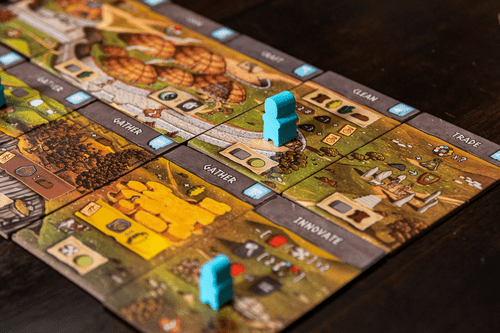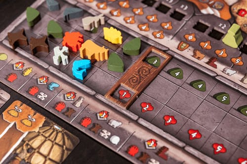 Côté pose d’ouvriers, vous débutez avec un Grand Ouvrier lors de la première manche, et gagnez 1 Petit Ouvrier supplémentaire au début de chaque nouvelle manche. Après avoir résolu votre effet de carte, vous pouvez envoyer vos ouvriers disponibles sur les 10 tuiles Action du jeu (chacune ne peut contenir qu’un Grand et un Petit ouvrier). Ainsi, vous pourrez cuisiner afin de dépenser certaines ressources pour obtenir de la nourriture, mais aussi des os, des peaux ou de la laine. Vous pourrez aussi dépenser une certaine quantité d’un seul type de ressource pour progresser sur la piste commerciale (qui vaut là aussi des points en fin de partie). D’autres actions permettent de recruter des ouvriers journaliers, ou activer une action Récolte, piocher des cartes, etc.