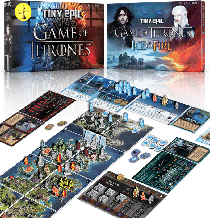 Par ailleurs, l’extension Ice & Fire permet d’avoir le mode coop, mais aussi deux nouvelles maisons jouables (les Targaryen et La Garde de Nuit). C’est avec l’extension qu’un 5e joueur peut être accueilli à la table. On y trouve aussi des cartes supplémentaires qui étendent Westeros vers le nord au-delà du Mur, une construction en carton du Mur, des cartes d’intrigue supplémentaires…