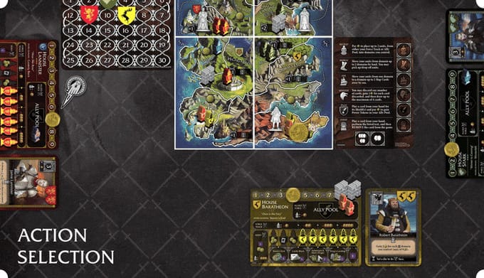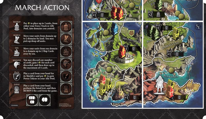 Parmi vos actions : Le recrutement, pour se déployer ou former des alliances ; la marche ou la navigation, deux méthodes efficaces pour conquérir des territoires, assiéger des châteaux et vaincre vos ennemis ; mais aussi le Murmure qui vous permet de manipuler votre main de cartes et d’augmenter vos réserves d’or, ce qui vous donne l’avantage de comploter contre les maisons rivales, de renforcer vos forces et de déclencher des événements. Chaque carte peut être utilisée de l’une ou l’autre de ces trois façons.