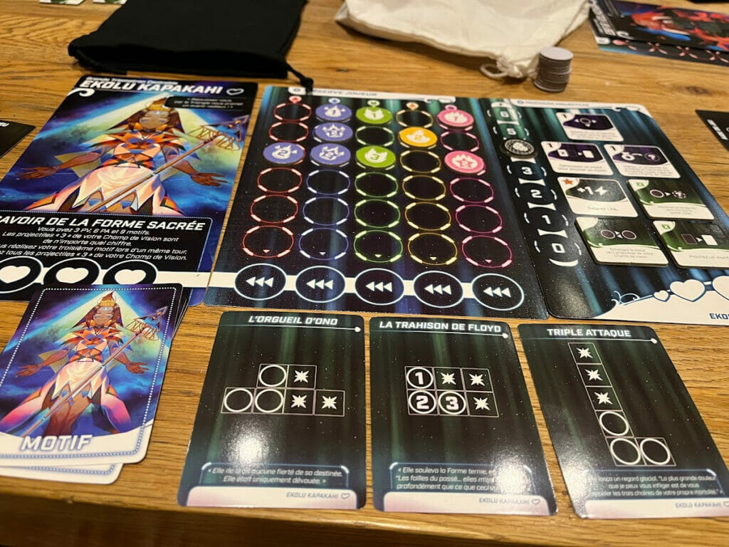 Chaque héroïne du jeu n’a en tête que l’idée de terrasser ses adversaires. Chacune sa façon de se battre pour faire disparaître de son plateau des projectiles qui viennent s’accumuler, en utilisant ses points d’action et former ainsi des motifs, qui sont des cartes objectif. Un motif est un schéma de placement à reproduire un endroit dans sa grille. Sur cette carte objectifs se trouvent aussi les projectiles qui seront envoyés à l’adversaire de gauche quand le motif est réalisé ! Un puzzle, mais un puzzle frénétique, la manche ne dure que 3 minutes.