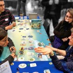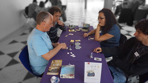 Après avoir vagabondé dans les allées du salon (profitant de l’heure et de la faible affluence matinale – les joueurs sont plutôt des noctambules ! -) pour voir tout ce qu’il y avait à offrir, je me suis attablé à une partie de Mare Nostrum qui allait commencer, avec une famille et deux enfants.