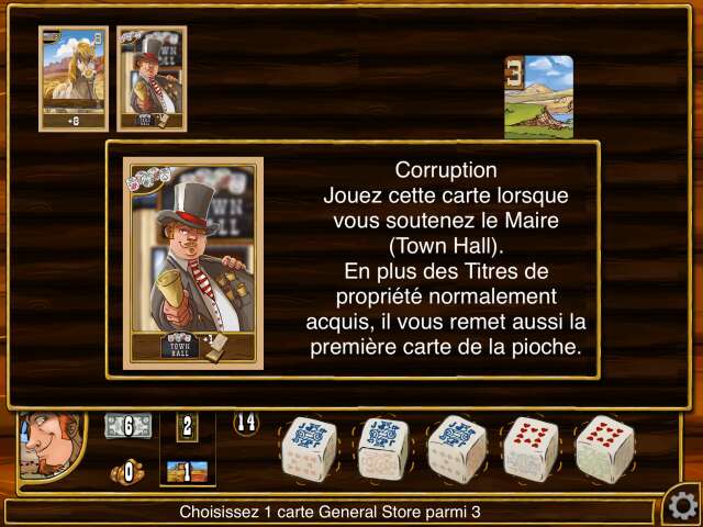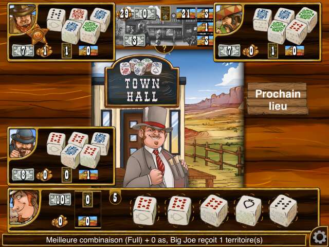 - La Mairie (Town Hall) : Meilleure combinaison poker. Ici le joueur ayant la meilleure main de poker l’emporte. Il piochera une carte de propriété rapportant directement des points de victoire. De plus si votre combinaison comporte un as, vous piocherez une carte de plus. 2 as ? 2 cartes de plus !… Cumul de points de victoire assuré !