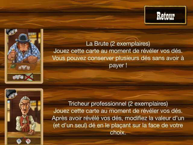 De plus certaines cartes comme « La brute » ou « Le tricheur professionnel » vous permettront de faire varier les résultats de vos lancers ou de ne pas payer vos gardes de plusieurs dés à la fois.