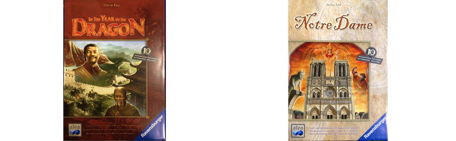 Deux grands et vénérables jeux sont réédités chez Ravensburger, et ça c’est une bonne nouvelle déjà parce que ça met un coup derrière la nuque des vils spéculateurs qui, comme dans un jeu de société, achètent à bas prix et attendent que l’argus remonte pour revendre au prix fort une fois le jeu plus édité ! Deux Feld introuvables sont donc réédités dans une version anniversaire « 10 ans » : L’année du dragon et Notre Dame.