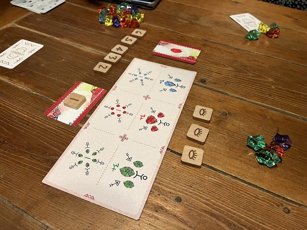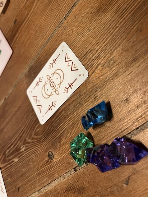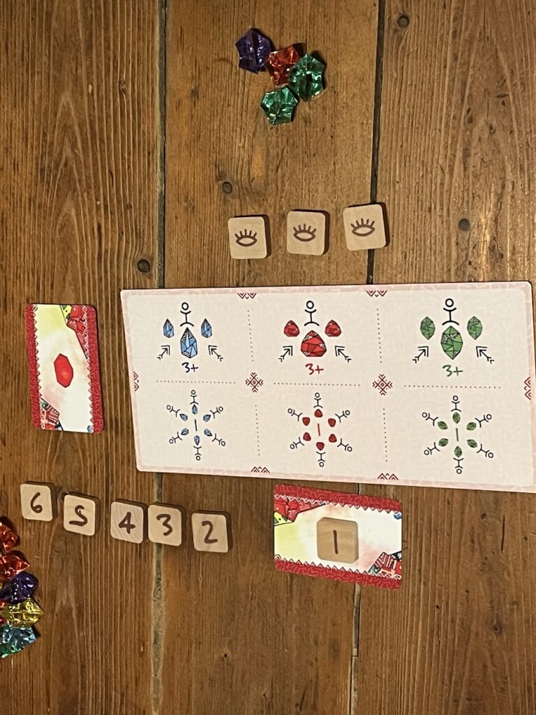 Déjà c’est un jeu coopératif à communication restreinte : on est des gens qui font des rituels sans parler en réalisant des objectifs sur des cartes secrètes et un plateau central. Et chaque joueur a devant lui un tapis (une carte vide), quatre gemmes de couleur aléatoire et un objectif : une inspiration. On la consulte et là, stupeur, on s’aperçoit qu’il faut au moins 5 gemmes pour la résoudre. Par exemple, 5 gemmes vertes. Quand moi j’ai deux jaune, une violette et une rouge devant moi au tirage de départ. Bon, bien embarquée, l’affaire. L’économie est fermée : il n’y aura jamais plus de gemmes autour de la table ni moins d’ailleurs, malgré une réserve centrale abondante. Et si chacun doit résoudre son Inspiration, c’est bien qu’il va falloir s’échanger les pierres… Le problème est tout à fait le comment.