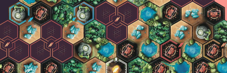 On démarre avec une arène dont la plupart des tuiles sont face cachée et il faudra explorer pour les révéler avant de pouvoir s’y déplacer. Chaque tuile contient différents types d’hexagones aux différents effets : les ressources (Cristaux et Résines) sont les monnaies du jeu, les Observatoires permettent d’acheter des jetons Anticipation qui augmentent les chances de se protéger d’une attaque, l’Interface donne accès à de nouvelles cartes pour améliorer son deck, etc.