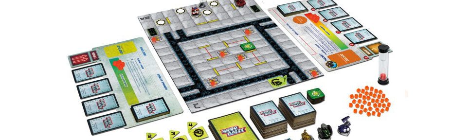 Roborally est une course délirante de robots dans des circuits tout aussi délirants. Il se jouait à partir de 2 jusqu’à 8 joueurs. Le principe : On programme tous en même temps ses déplacements secrètement (par exemple : droite / droite / gauche etc), le premier qui termine, retourne le sablier, ce qui en général met la pression aux autres joueurs. Ceux qui n’ont pas fini ? On place leurs cartes restantes au hasard ! Et on résout dans l’ordre du tour l’avancement des robots.