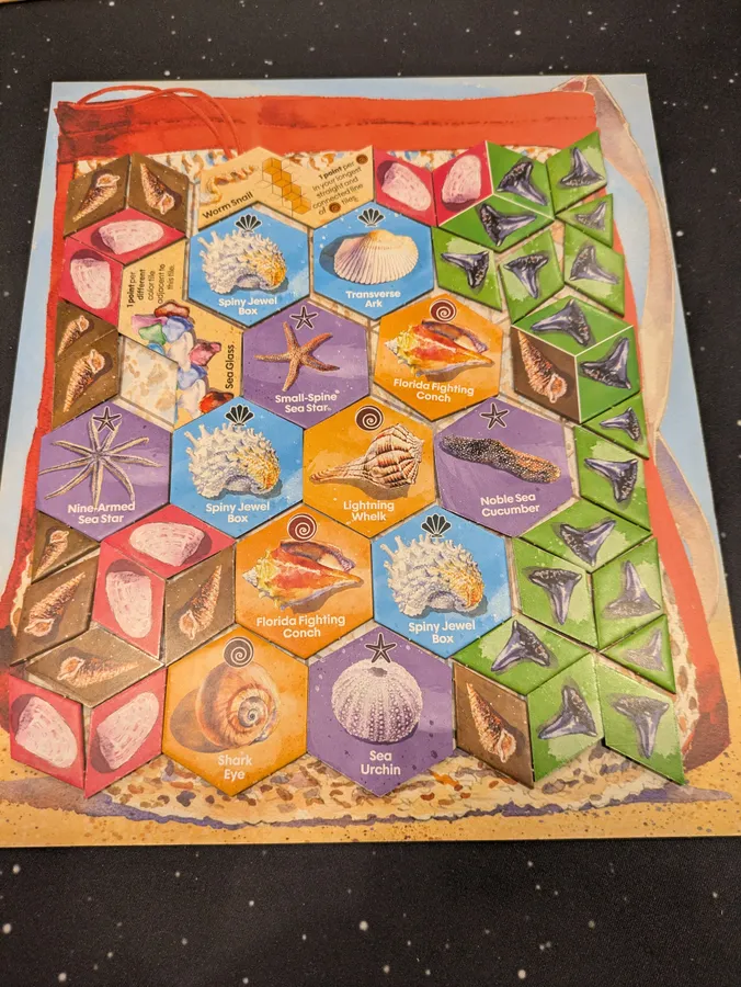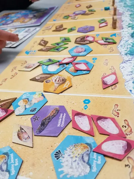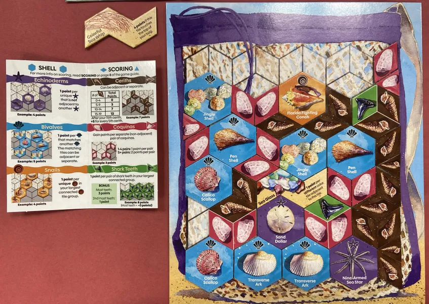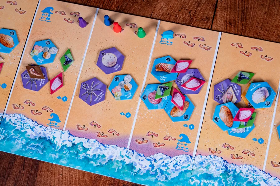 Sur la plage de Sanibel, chaque coquillage a sa valeur et sa stratégie. Les hexagones rapportent des points selon leur isolement ou leur correspondance : les échinodermes seuls valent un point, les bivalves se combinent pour en rapporter davantage, et les escargots forment des groupes qui font grimper le score. Les losanges, quant à eux, récompensent la quantité et les associations : cérithes et chaubettes se comptent par paire, tandis que les dents de requin donnent des points supplémentaires aux plus grands groupes.