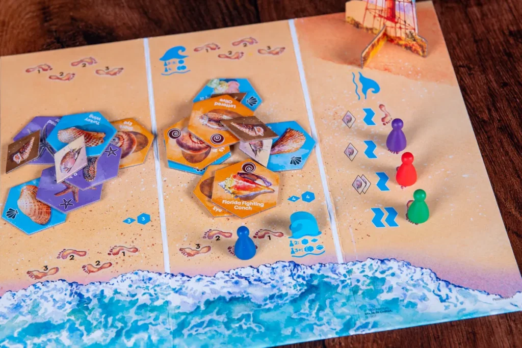 Tous les joueurs partent des transats (première section). La plage est partagée en neuf. À leur tour de jeu, les joueurs s’avancent le long des dunes d’autant de sections qu’ils le souhaitent. Une seule règle s’impose : ils doivent s’arrêter à la neuvième section, là où se trouve le phare de Sanibel. Puis il s’agira de repartir vers la première section, le long de l’eau, pour retourner aux transats. La scénographie et le cadre temporel de ce jeu sont époustouflants. Jusqu’au phare, on évolue dans le haut du plateau, le bord de mer encore chargé de coquillages. Cette mise à distance donne l’impression d’une plage-trésor qui abonde. Le retour aux transats, se fait les pieds dans le ressac des vagues, la plage a naturellement perdu de ses coquillages. Le jeu impose également une distribution plus forte des petites tuiles, donnant l’illusion que la mer a tout emporté ou que, de près, la réalité de ce qui reste comme coquillages est bien différente.