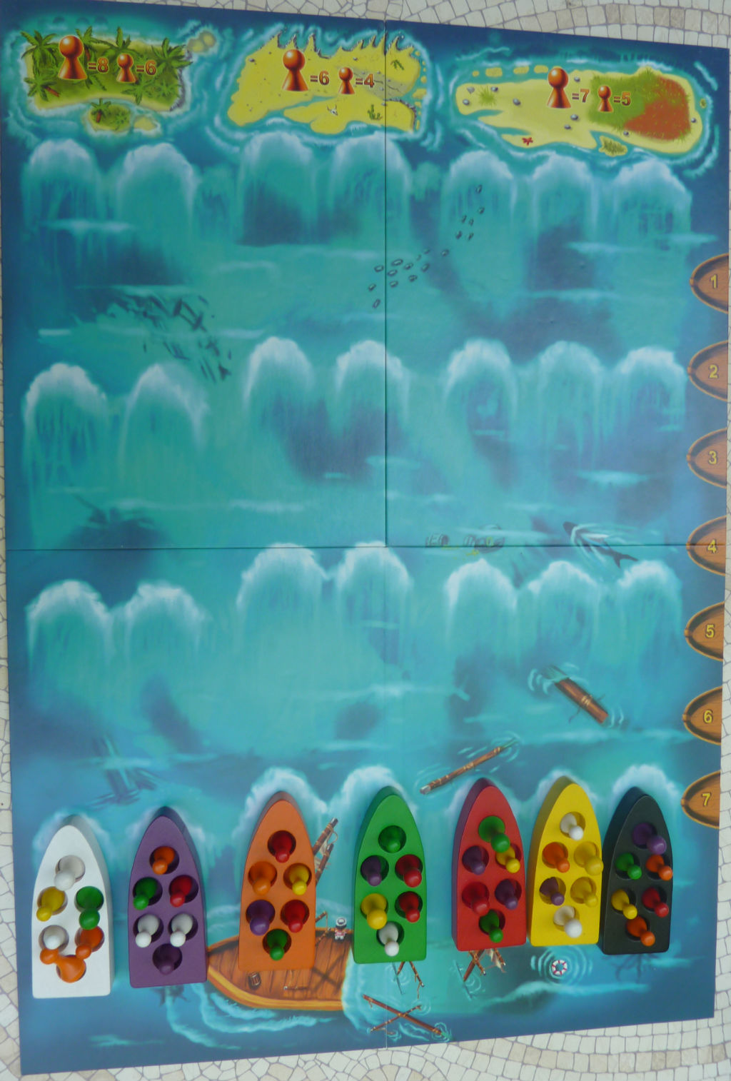 Dans notre partie, les choses ont commencé gentiment : on a fait avancer le bateau ou presque tout le monde s’était placé, puis le premier pion s’est transformé en viande à requin… et on enchaîne. Comme encore beaucoup de joueurs étaient présent dans ce canot, il a continué à avancer jusqu’à l’île. Un Capitaine a fait autorité puis plusieurs joueurs ont alors placé des pions sur l’île la plus à droite.