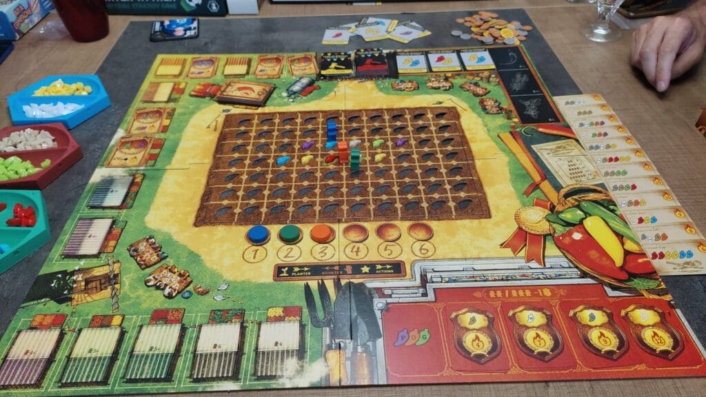Le matériel est à l’image du jeu avec de très bons éléments, mais quelques écueils. J’aime beaucoup les piments qui viennent parfaitement se placer dans les encoches des plateaux. Par contre nos meeples fermiers sont de bonne taille, masquant une partie du plateau central, ce qui nous contraint à quelques contorsions du cou, telle la girafe lors de son stretching du matin.