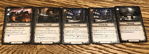 Le cœur de votre personnage sera donc son deck de cartes. Celui-ci, on l’a dit, va s’étoffer au fur et à mesure de la partie. Mais ces cartes n’auront pas pour unique intérêt de vous dire si vous réussissez ou échouez dans une action. Vous pourrez en effet « préparer » des cartes, c’est-à-dire les placer devant vous face visible pour profiter de leur bonus. D’une part, vous aurez des bonus permanents mais vous pourrez défausser ces cartes pour obtenir, à un moment donné, un bonus encore plus intéressant. Bien sûr, les cartes puissantes seront également celles avec le plus de réussites dessus, et il faudra donc choisir entre les laisser dans notre deck pour les réussites, ou bien les placer devant soi pour leur effets. La gestion de ce deck est probablement l’idée la plus originale du jeu, et la façon dont évolue votre personnage.