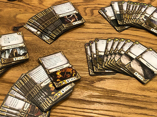 Ce côté générique n’est pas aidé par les illustrations. Elles sont superbes, rien à redire. J’en ai déjà parlé d’ailleurs : là aussi, comme ils le font déjà sur d’autres univers, les illustrations ont été reprises d’autres jeux, en particulier du Seigneur des anneaux le JCE. D’un point de vue gestion des coûts, cela peut se comprendre pour une entreprise. Mais là aussi, le résultat est que des illustrations qui avaient une idée forte et précise dans le premier jeu deviennent… communes, dans tous les sens du mot. On ne sait plus trop ce qu’elles représentent ni ce qu’elles décrivent. C’est dommage, la couverture était assez prometteuse.
