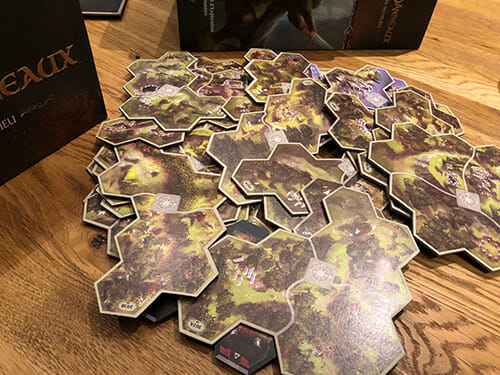 Sur le plan des mécanismes, je suis d’accord, rien de bien nouveau, un assemblage de mécaniques bien conçues. On retrouve beaucoup de Assault sur Empire par exemple. Avec aussi un aspect « course » où il faut mesurer le temps et ne pas trop traîner en route. Adepte du grind, passez votre tour ! Moi n’aime bien, car cela implique quelques dilemmes et provoque des discussions autour de la table : « – Non mais là, cet arbre étrange, faudrait aller voir ce que c’est. Si il y a un point d’intérêt, c’est pas pour rien. – Oui mais on n’a pas le temps, et des renforts sont en train d’arriver, on ne pas va prendre le risque de se retrouver encerclé ! … ».