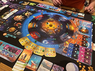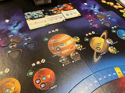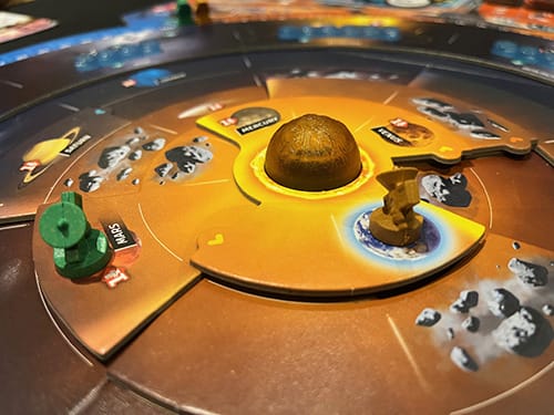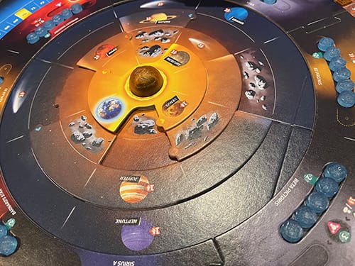 L’effet d’influence réciproque du plateau mobile s’avère d’abord assez subtil mais tout à fait remarquable in fine : le système solaire évolue avec les actions des joueurs (certaines de nos actions font tourner des rondelles du plateau, modifiant nos futures options) le rendant nettement moins prévisible qu’un Maracaibo par exemple. Vous jouez, le plateau tourne, et en retour votre stratégie évolue suivant sa configuration. Non seulement vous interagissez ainsi en deux bandes avec les autres mais il y a un effet rétroactif pour vous-même. Des chemins se ferment soudainement et d’autres s’envisagent. Hey Neptune, mais tu n’es pas si loin que ça finalement !