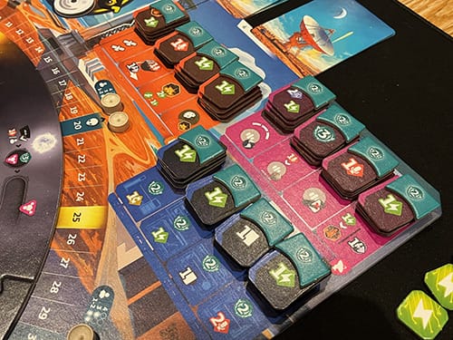 Attention, éviter les Exteriens à deux joueurs, leur système d’incentive étant mal fagoté. Par contre, pour les secteurs dans lesquels on place les signaux, si la majorité est dure à faire, cela apporte tout de même des traces de deux type (ordinateur et captation) ; il y a de plus un vrai moteur à faire sur l’ordinateur, octroyant des ressources non négligeables. À deux joueurs, il suffit de raccourcir les secteurs avec un marqueur neutre permanent, ignoré pour les décomptes de majorité et placé à droite de la piste.