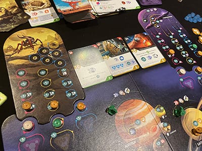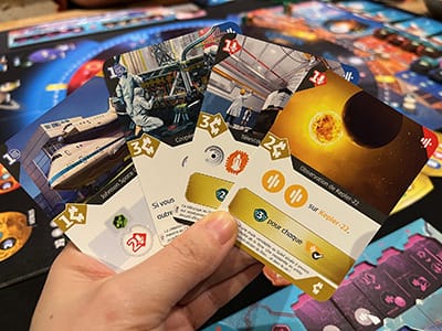 À l’instar de son voisin interstellaire Terraforming Mars, la grande force du jeu et sa rejouabilité certaine se cache derrière ses cartes : celles-ci sont toutes uniques (au nombre de 138), et proposent des actions reprenant tous les pans du jeu tout en permettant toujours d’être défaussées de manière utile. Elles peuvent servir de monnaie, d’action, de revenu, de missions… Leur côté multitâche ajoute une vraie souplesse en jeu.