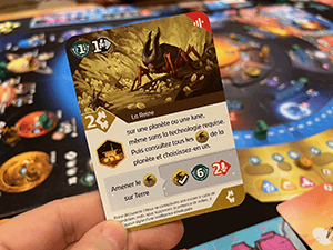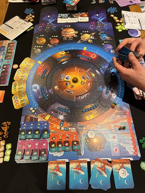 La complexité (poids BGG 3.71/5) peut déstabiliser sur les premières manches voire la première partie (merci l’aide de jeu !), jusqu’au déclic où tout devient plus fluide (les risques d’analysis paralysis demeurent, évitez si possible la configuration 4 joueurs). Une fois appréhendé, on apprécie particulièrement cet environnement réactif (plateau évolutif, arrivée des aliens en cours de route…) et l’espace, sans jeu de mot ou presque, laissé aux joueurs, grâce aux cartes polyvalentes. Nul doute qu’il faudra un certain nombre de parties pour faire le tour de ce système solaire. D’ailleurs, la trajectoire de ce nouveau satellite pas si artificiel semble déjà calculée tant le succès du jeu laisse imaginer des extensions avec de nouveaux aliens et de nouvelles cartes.