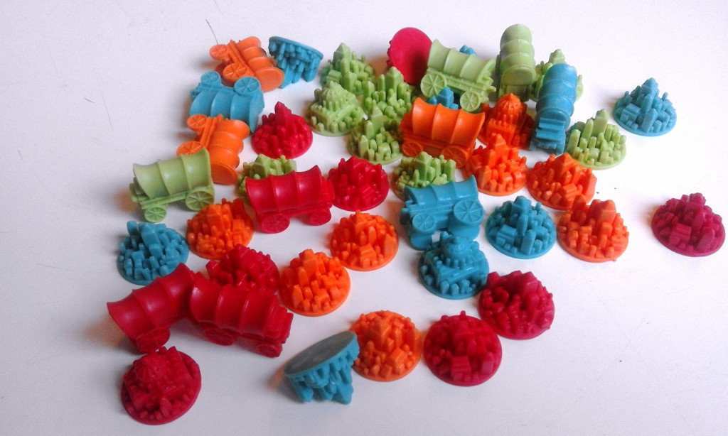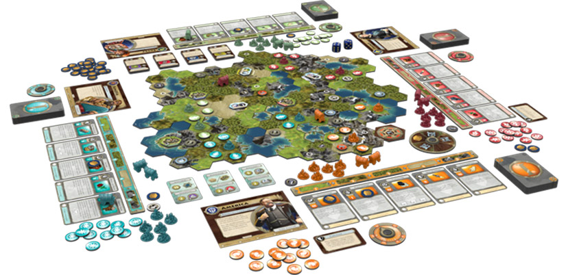 Le plateau : il est construit avec des planches d’hexagones bifaces et offre donc plusieurs configurations possibles, en décidant quelles ressources (le marbre, le mercure, le pétrole et le diamant) apparaissent et si les raids barbares menacent dans les régions.