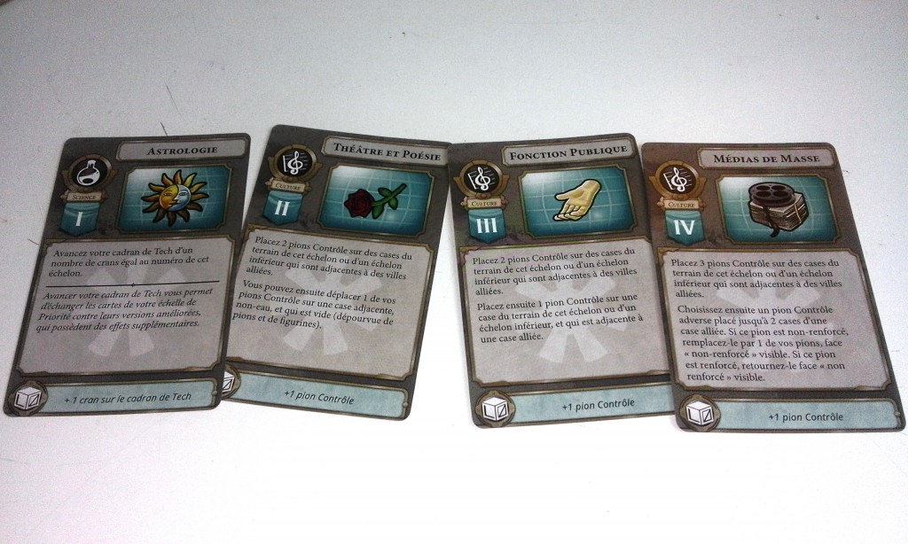 Grâce au cadran de Tech (une roue que l’on tourne), les cartes seront remplacées par un âge supérieur (on élimine la carte d’âge I pour la remplacer par une carte du même domaine d’âge II ou III ou IV). Ce principe permet de devenir plus puissant et d’offrir des possibilités graduelles au joueur (d’un déplacement lent de 3 cases, on passe à 6 cases avec le pouvoir de franchir les étendues d’eau).