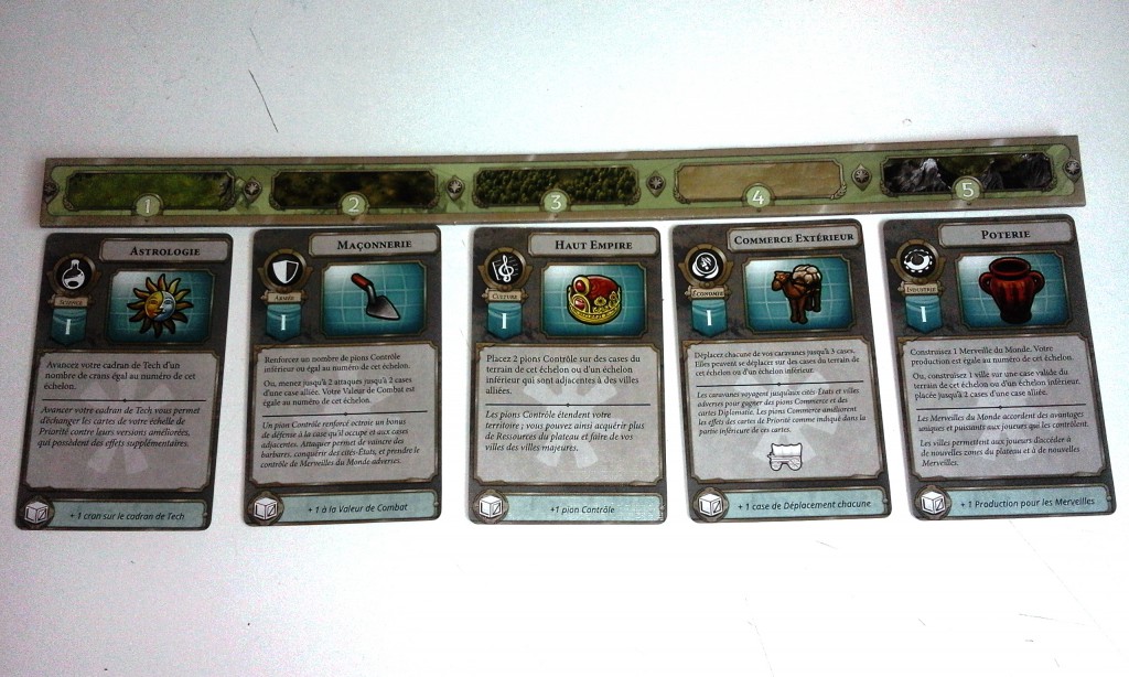 Ce nouvel élément est ce qui m’a fait craquer sur ce jeu. C’est tellement simple et pourtant porteur de choix difficiles que c’en est génial. Chaque barre de priorité contient 5 emplacements (1 à 5) : un pour chaque domaine.