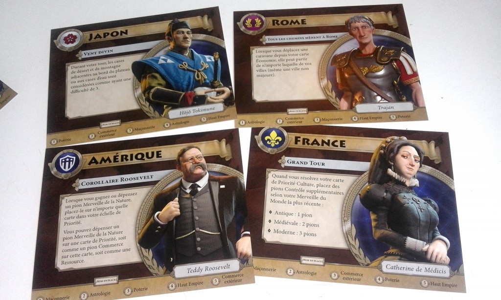 Chaque joueur part avec une identité et une compétence propre (Rome, le Japon, l’Aztèque, l’Amérique, la France, l’Egypte, la Sumérie et la Scythie (ce n’est pas Londres)) et 5 cartes des domaines cités que l’on placera sous la barre de priorité suivant un protocole propre à sa nation. Les objectifs de victoire (il en faut 3 pour gagner) seront visibles et commun à tous.