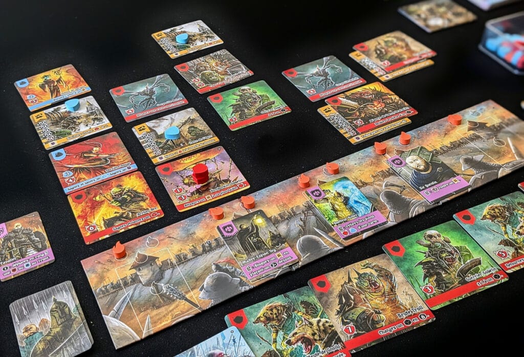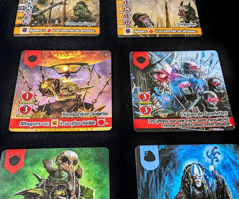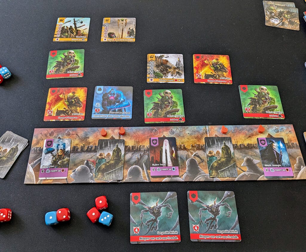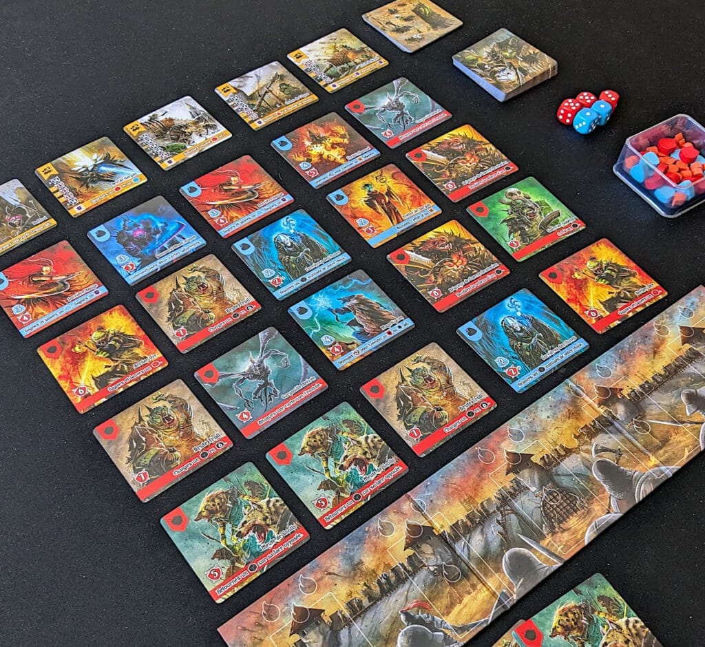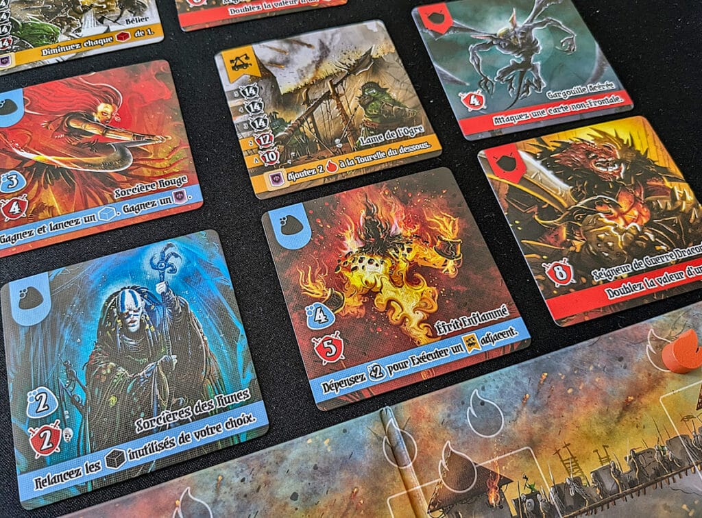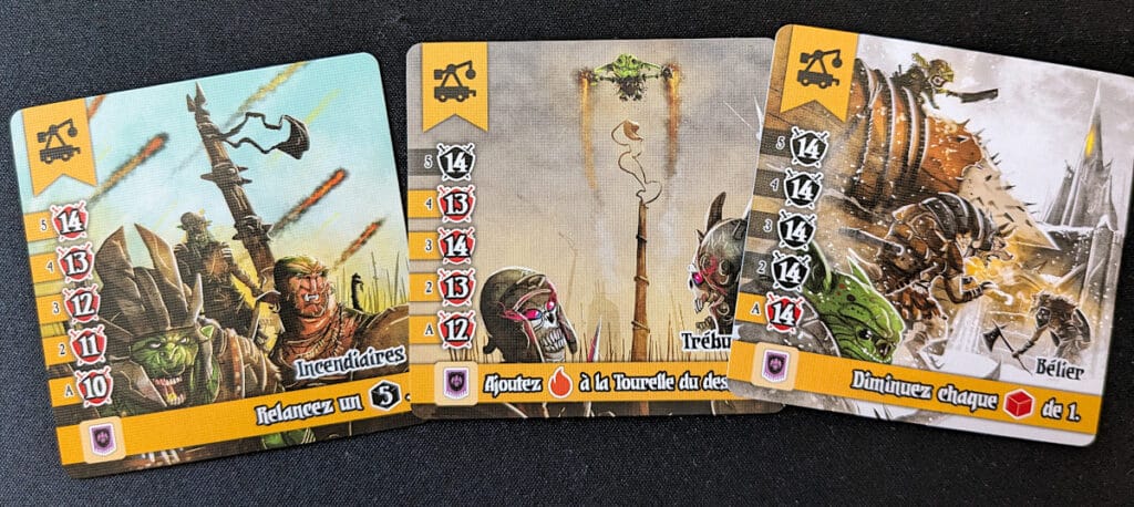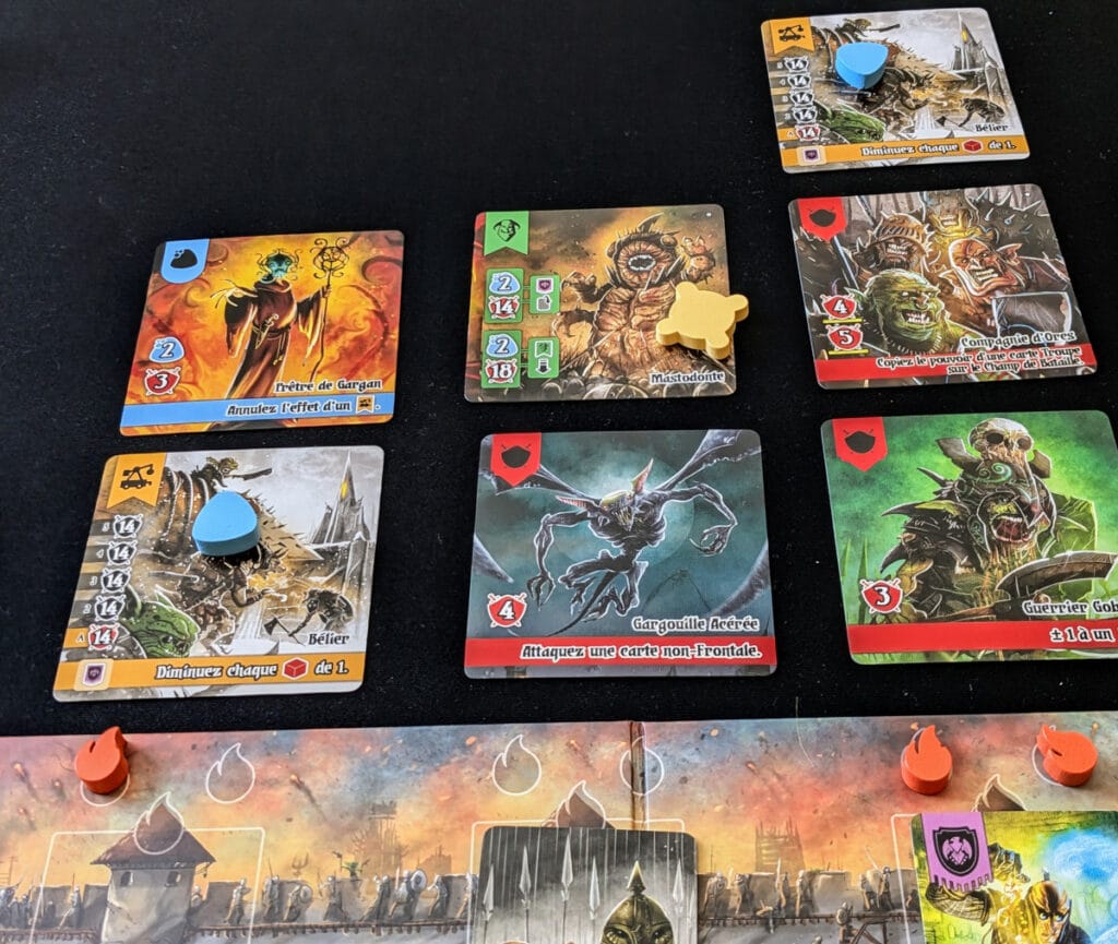 À la mise en place, vous allez disposer devant vous une grille de cartes carrées. Celles-ci représentent des vagues de troupes ennemies venant s’écraser ligne par ligne sur vos murailles. À l’arrière seront disposés des engins de siège, qu’il sera difficile d’atteindre mais qui infligeront des dégâts sur vos fortifications. À l’avant, la grande majorité des cartes seront des troupes au sol ou volantes.