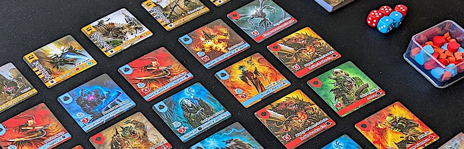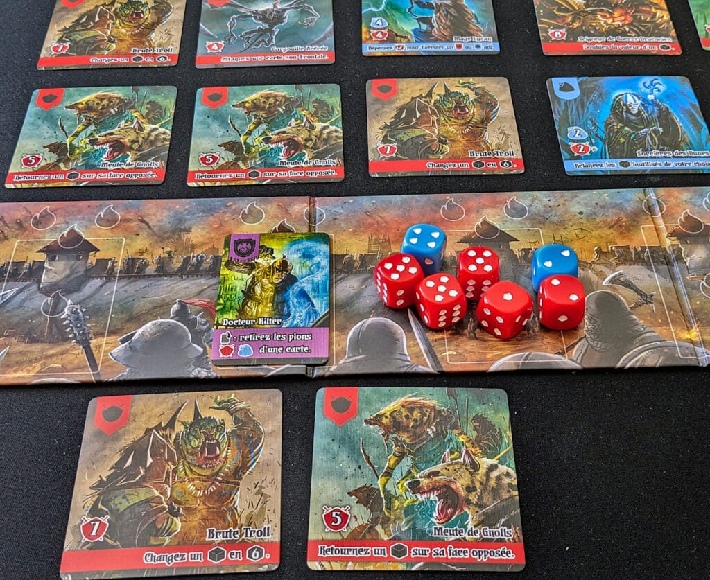 Une fois le tour de jeu engagé, le placement de dés commence. Ceux-ci représentent des dégâts (physiques en rouge, magiques en bleu) que vous infligez sur les cartes ennemies et vous devrez les répartir intelligemment. Vous ne pourrez pas atteindre toutes les cartes ennemies, mais seulement celles qui forment le front. Les dégâts portés seront immédiats. Si vous en placez suffisamment sur une carte, vous la vainquez et la récupérez directement dans votre main. Vous pourrez ensuite utiliser quand bon vous semble le pouvoir qui est inscrit au bas de celle-ci. On va ainsi jouer son tour de jeu en plaçant successivement les dés de dégâts, en récupérant les cartes et en les utilisant dans la foulée. Cette dynamique d’enchaînements est assez plaisante.