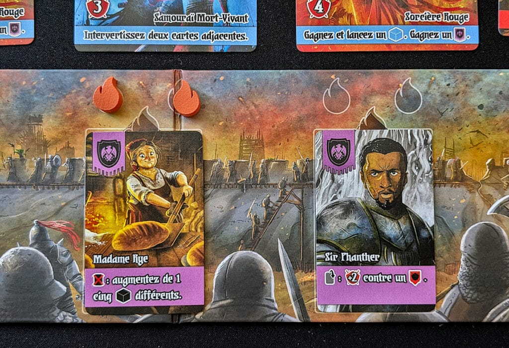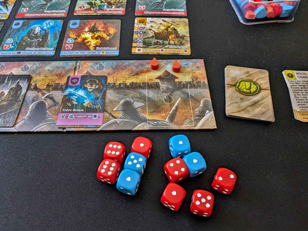 Il peut cependant exister des cas où rien ne va : les mauvais scores aux dés, les cartes tant souhaitées encore dans la pioche. Cela reste un jeu de dés ! De même, certains effets de cartes Evénement ont la main lourde comparés à d’autres. Également, les fins de parties sont fragiles. Même si vous vous êtes bien placés tout le long, un rien ne peut tout faire basculer : le mauvais engin de siège pioché à la fin, ou bien parmi les cartes restantes, l’absence de pouvoirs permettant d’agir sur les dés, et c’est le drame. Encore une fois, le drame peut être évité ou du moins limité, si vous avez ménagé vos efforts pour anticiper les fins de parties, et j’ai bien eu le sentiment que c’est possible !