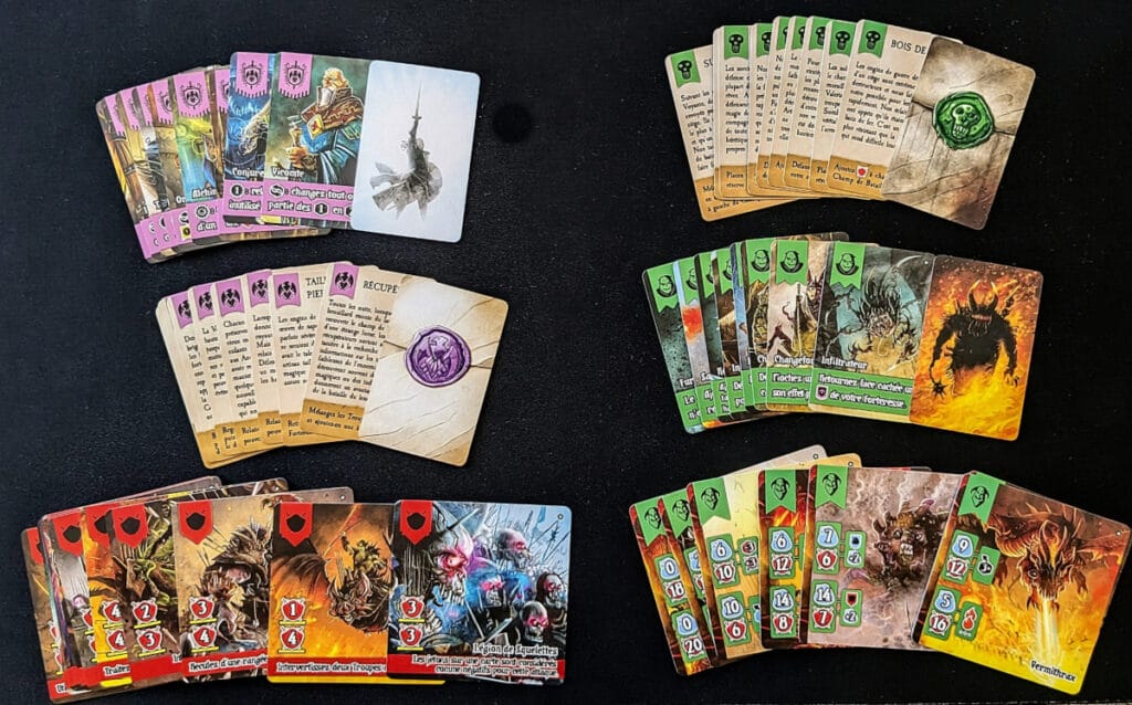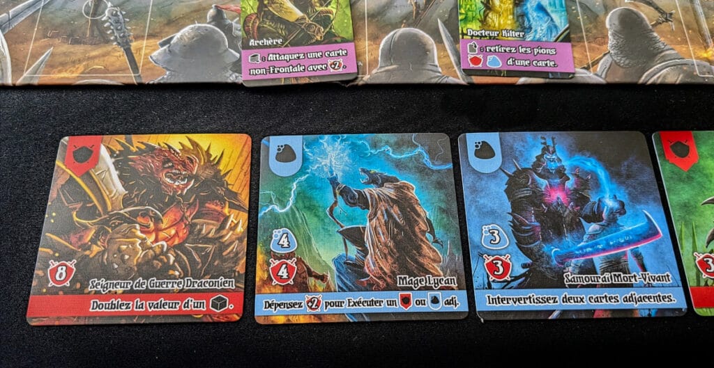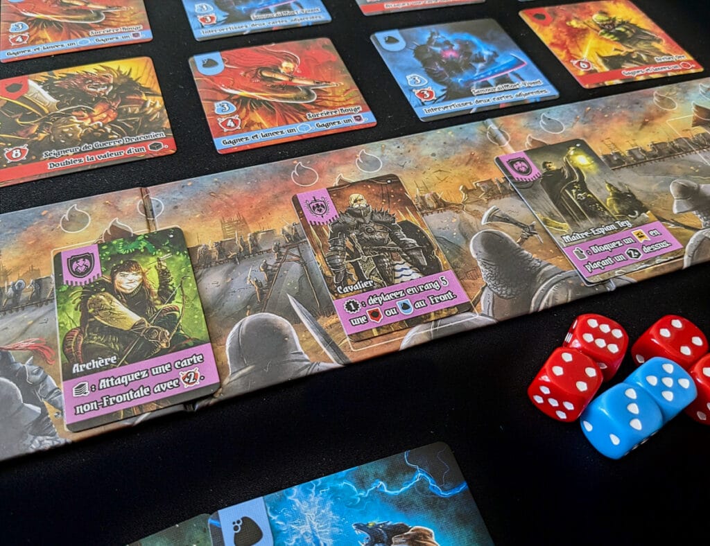 Plus généralement, les pouvoirs des cartes auront chacun leur utilité à un moment du jeu, et vous ne devrez en écarter aucun. Certaines agissent sur les dés, en inversant par exemple leur face, en doublant leur valeur, en en faisant relancer plusieurs. Certaines permettent de permuter des cartes ennemies sur le champ de bataille, pour pouvoir les placer à votre portée par exemple. D’autres encore vont permettre de vaincre sans concession des cartes voisines, quelle que soit leur force. Chacune est utile et chacune sortira tôt ou tard de la pioche.