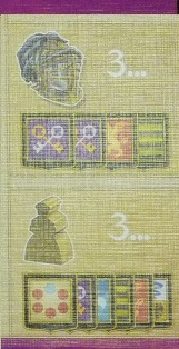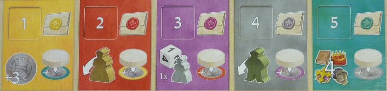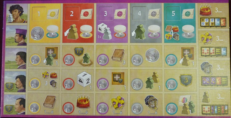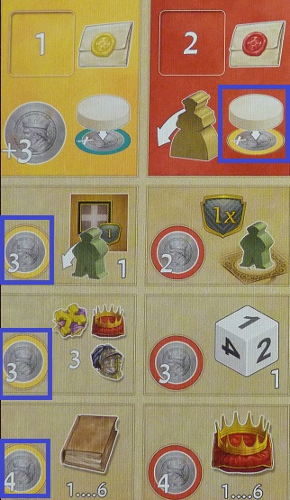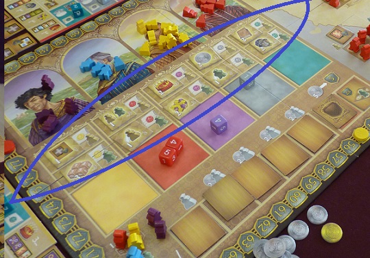 En fonction de la couleur du dé choisi, il faudra payer un coût supplémentaire, en florins, afin d’avoir la possibilité de jouer ce dé : ce coût correspond à la différence entre la valeur du dé et la valeur de la case colorée. Si par exemple, je prends un 1 bleu, il faudra que je dépense 4 florins (1 – 5 = – 4). Bien évidemment, ne rêvez pas, si la valeur du dé est supérieure à celle de la case à activer, vous ne gagnerez pas d’argent (mais vous n’en dépenserez pas, ce qui est bien!).