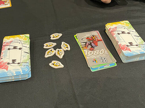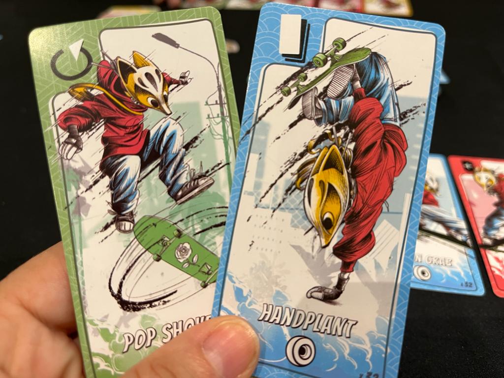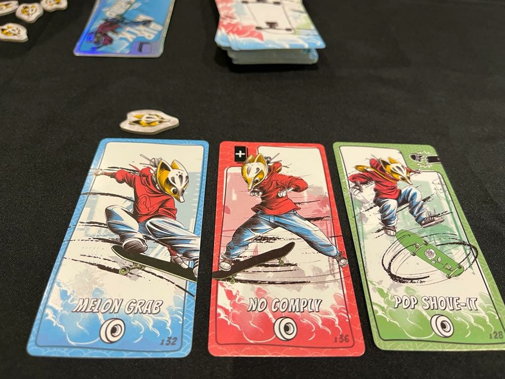 Vous essayez d’enchaîner les tricks (figures acrobatiques) en piochant des cartes depuis l’une des deux pioches (ou depuis votre main) : plus on pose de cartes plus on marquera de points, mais si on accumule trois couleurs identiques ou trois symboles de planche brisée, on perd alors toutes nos cartes posées.