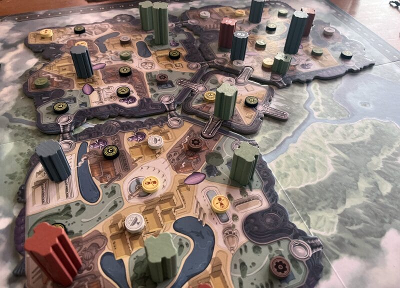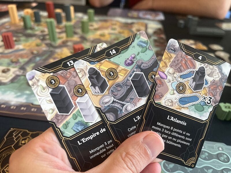 Une mécanique ultra simple en apparence, mais de nombreux dilemmes vont venir taper dans votre boîte crânienne. Optimiser son placement en fonction des cartes panorama que l’on aura tirées pour la partie (elles seront résolues à la fin des deux manches), gagner des majorités sur les îles. Les buildings sont de différentes tailles et en fin de manche (ou ère), le ou les joueurs majoritaires gagnent 5 points.