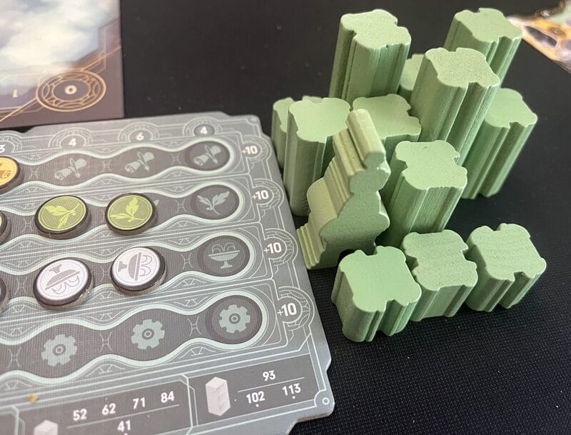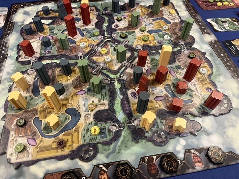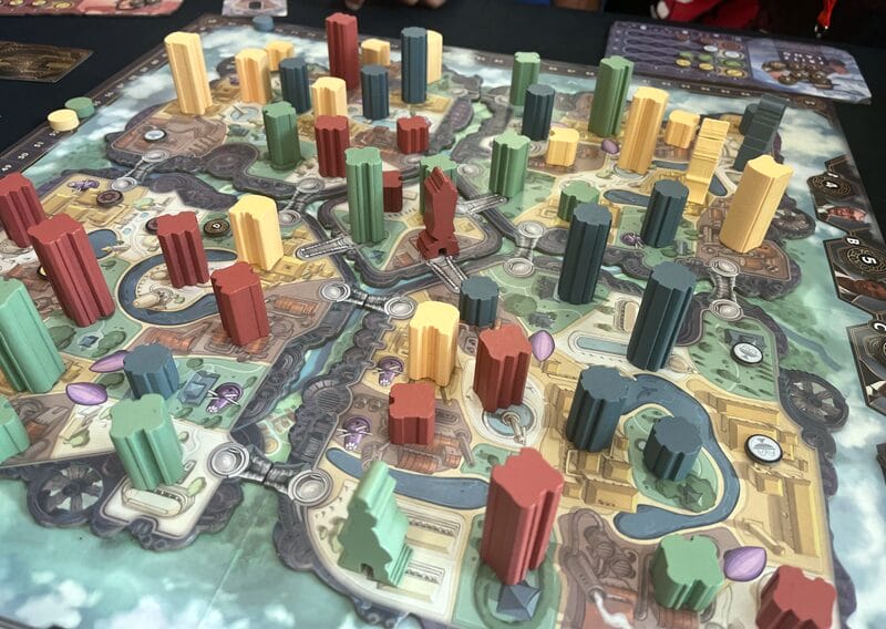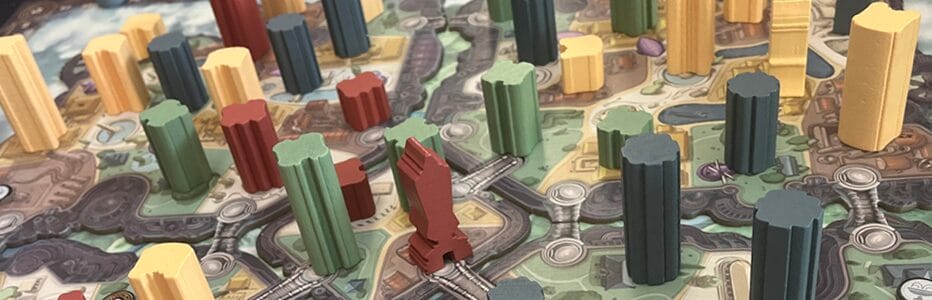 Entre Skyrise et Metropolys, je n’ai pas complètement tranché. La fin brutale faisait le charme de Metropolys et on apprenait par l’échec, pas de mécanique de rattrapage ou « catch up ». Dans Skyrise un joueur à la traîne ne gagnera probablement pas, mais pourra grappiller des quartiers en fin de partie parce qu’il sera le seul encore sur le plateau. La petite salade de points réduit les écarts et laisse flotter une forme de suspens, mais il n’y en a pas vraiment, cela reste un jeu calculatoire et exigeant.