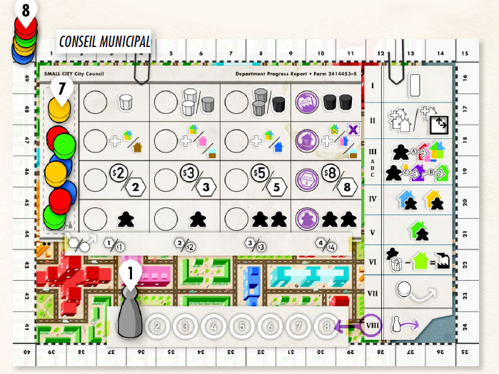 Chaque joueur possède 12 meeples Citoyens, situés au départ à droite de l’Arrondissement, sur la zone « Espace Carrière » du plateau personnel.