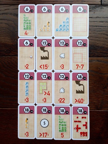 On débute en tirant deux cartes « objectifs » (la fameuse promesse électorale) et chacun en conserve une secrètement. Elle ne sera révélée qu’à la fin de partie, vous pourrez vous ajouter des voix si vous êtes parvenu à les tenir. Cela peut être des contraintes de construction comme bâtir sur un carré de 7×7 uniquement, ou des objectifs de développement comme avoir un taux de pollution supérieur à 40% ou avoir une Caserne et un Commissariat (sachant que ceux-ci sont pas en nombre suffisant pour que tout le monde puisse en construire).
