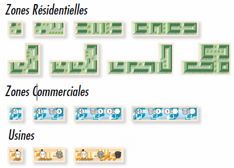 Chaque type de zone (Résidence, Commerce, Usine, Culturelle) a sa couleur, son niveau de développement max, des pouvoirs spéciaux et des conditions de constructions particulières.