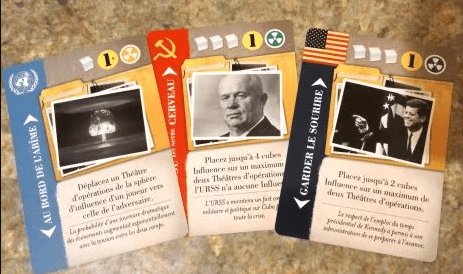 Le jeu sera divisé en 3 zones. D’un côté les rouges (URSS), de l’autre les bleus (USA) et au centre, la zone neutre. Le but du jeu sera double cette fois : gagner des majorités et amener de son côté les cartes (théâtre d’opération), ceci permettant de gagner les égalités.