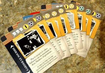 Pour démarrer, on pioche une carte au hasard et on la place face cachée au centre de la table, elle représente Cuba. Chaque joueur a deux cartes en main, à chaque tour il en joue une et en pioche une. Tout à fait dans l’esprit des jeux de la sphère T.S, la carte que vous jouez à deux actions possibles : Poser des cubes d’influence sur un théâtre d’opération ou activer l’événement. Si vous jouez une carte de la puissance adverse, cette dernière pourra donc activer l’événement contre vous.