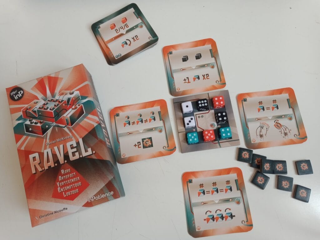 Ravel est un pur solo avec une grille, des dés et des contrats à remplir. Placez la grille et remplissez-la avec les 8 dés (2 par couleur). Près de chaque bord on pose 4 piles de 4 contrats (les rouages) de tout acabit : les deux dés oranges doivent être adjacents à cette carte/les 3 dés doivent être de valeur inférieure à 4/supérieure à 14/ former une suite /être impairs… Pour agencer les dés de façon satisfaisante nous sommes aidés par des jetons bricolage. On peut en les dépensant échanger la position de deux dés ou changer la face. Le contrat réussi, on gagne la récompense qui permet de changer de place des contrats, de bricoler, relancer les dés, basculer la grille de 90°etc.