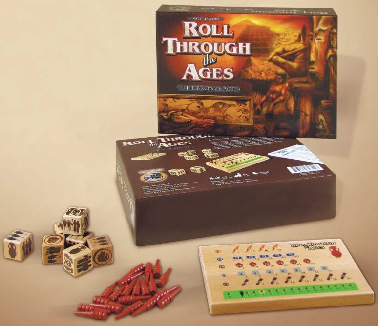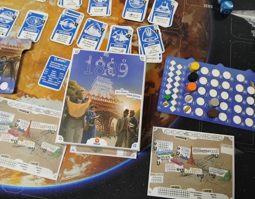 C’est en 2008 que sort Roll through the ages. Plateau et dés en bois, ce jeu de civilisation a de l’allure et verra plusieurs extensions. L’auteur, on le connaît, il crée la même année un des classiques du jeu de société coopératif, Pandemic. Roll… était réapparu dans une version 3D sous le nom de Era en 2019 et, presque 20 ans plus tard, il revient une fois encore. Le format a été réduit, le matériel n’est pas aussi qualitatif à part les dés, cœur du jeu. Cette fois, c’est l’exposition universelle qu’il faut bâtir au travers de ces monuments emblématiques, dont la tour Eiffel. Gestion de son argent, des contremaîtres, sabotages et constructions sont au programme, aidés par des cartes de développement indispensables.