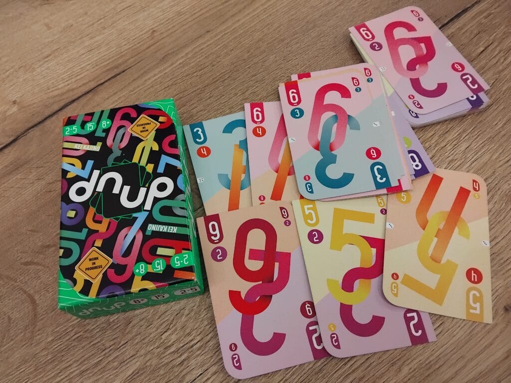 Pour les amateurs de jeux de plis/défausse, Revolve! fait figure de graal introuvable. Faisait. Car le jeu est à présent traduit sous le nom de Dnup. À l’instar des jeux de cartes actuels, les illustrations sont plaquées, des gros chiffres colorés sans vraiment d’âme. L’intérêt est ailleurs. Dans l’esprit d’un Linko et Scout, si vous y avez goûté, voilà un jeu qui se tourne, se retourne, se récupère ou se défausse, le but étant de vider sa main. À son tour, on peut poser une carte, une paire, un brelan etc. Le suivant peut ajouter une carte à ce que j’ai posé, retourner sa main et ainsi découvrir de nouvelles valeurs, mettre une combinaison identique mais plus forte et ainsi redonner les cartes (en les retournant) à son propriétaire, prendre les cartes posées (et les tourner). Ces quatre possibilités permettent de se vider, se renforcer tout en pourrissant l’adversaire.