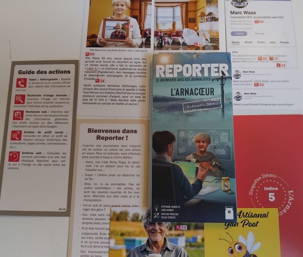 L’infatigable Stéphane Anquetil (aidé ici de Ludo Achraf), revient, après Crime Zoom et Pixel Aventures avec un nouveau concept d’enquête. Nouveau, c’est peut-être un bien grand mot, on y retrouve l’esprit de Crime Zoom et de Suspects (Guillaume Montiage). Des enquêtes plutôt narratives, même si, dans cette démo, nous ne sommes pas noyés par le verbe. Nous voilà journaliste, pas de base de données policière, d’insigne, tout se fait au bon sens. Cartes allongées, on y trouve à la fois des photos, des articles, des extraits de compte internet, de la publicité, mais aussi des réponses quand on se penche plus précisément sur un détail et que son numéro nous renvoie piocher une carte explicative.