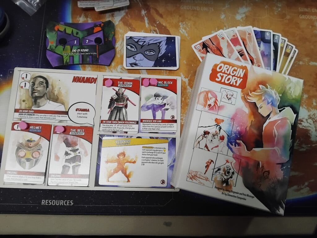 Jeu de plis, jeu de super héros à pouvoir, jeu de construction de deck… voilà beaucoup de choses pour cette boîte, ces paquets de cartes et ces livrets de personnage. Vous incarnez donc par exemple Nmandi, un enfant pleurant au milieu de ruines fumantes jusqu’au moment où des fleurs mystérieuses lui confient un super pouvoir. À chaque tour, on reçoit 3 cartes spéciales. Ce sont des super cartes. Elles peuvent être jouées à son tour, à la fin de la manche, si on ouvre en étant premier à poser une carte etc. Leurs effets sont légions : la couleur peut devenir atout, les adversaires n’ont pas le droit de jouer des valeurs plus élevées, les cartes vertes ont une valeur de + 2, si votre pari est réussi gagnez 3 PV…