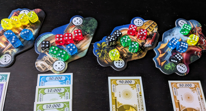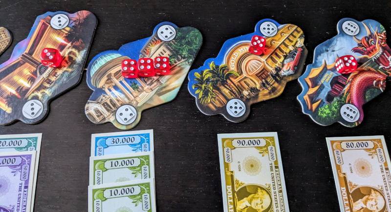 Autrement dit, vous jouerez simultanément pour vous-même et tous pour les joueurs adverses, en tentant de trouver l’arrangement qui vous sera le plus favorable possible. Vous tenterez au maximum de mettre les autres joueurs en situation d’égalité sur une même tuile Casino, réduisant leur gain à zéro. Parfois, vous n’aurez d’autre choix que de limiter la casse ou de vous faire perdre une majorité. À la fin de la partie, une fois tous les dés placés, vous comparerez votre score au total des gains des joueurs adverses. Seul contre tous.