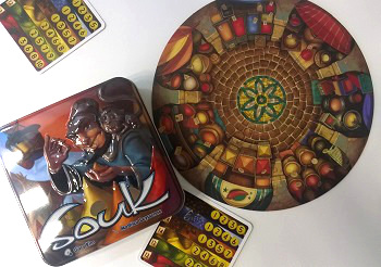 À chaque tour, on fera une (ou deux) mises secrètes, qui permettront de bluffer. Car plus qu’un jeu de manipulation de main ou de cours, Souk est un jeu de bluff ! Puis, tour à tour, on déposera des épices face visible dans les boutiques du souk pour altérer leur cours ou on posera une mise supplémentaire face visible. Et on répète l’opération (avec quelques restrictions : jusqu’à 4 épices du même type par boutique et jusqu’à 2 boutiques vendant la même épice) jusqu’à ce que le souk soit rempli ! Ensuite, on révèle les cartes misées, et on gagne des points en fonction de ce que l’on a misé. Plus de précisions ici.