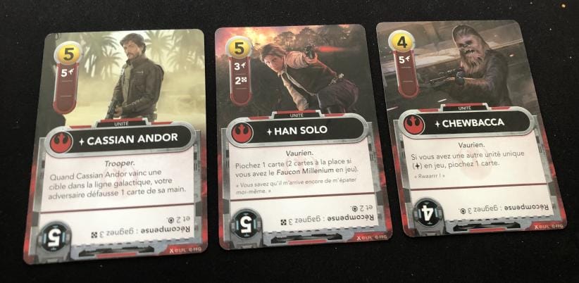 Nous retrouvons le principe de base de Star Realms, mais ici elles constituent les points de vie du joueur et pas seulement une protection, tout en lui donnant une capacité tant qu’elles sont en jeu, un peu comme les artefacts de Shards Of Infinity. Les bases et les vaisseaux capitaux de Star Wars The deckbuilding s’inspirent sans doute des deux jeux précédemment cités, mais les sensations en jeu changent. En jouant à Star Wars je n’ai pas eu l’impression de jouer à une copie d’un jeu connu en « skin » Star Wars.