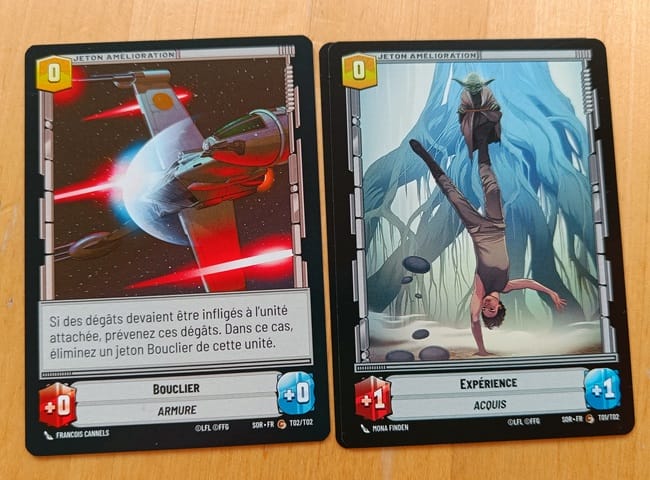 J’ai beau ne pas être super sensible au thème, il est là. Il aide. Difficile de ne pas voir plein de petites élégances à droite et à gauche sur la façon dont il fonctionne. Foin des dégâts qui disparaissent : vous les matérialisez via des jetons (certes fins dans les starter decks, mais autant vous dire que les gros joueurs les troqueront vite contre des substituts plus efficaces) qui restent de tour en tour. Des jetons Bouclier et Expérience viendront s’affixer à des cartes de façon très logique.